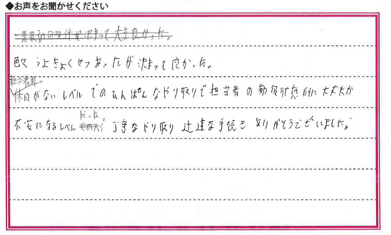 担当者の休日がないレベルでの頻繁なやり取りで担当者の勤務状態的に大丈夫か不安になるレベルだった。